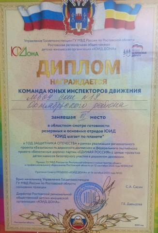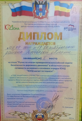 В 2025-2026 учебном году ребята основного отряда ЮИД "Перспективные ребята" и резервного отряда ЮИД "Дорожный дозор" приняли участие в районном смотре готовности отрядов ЮИД "ЮИД шагает по планете". Заняли 1 место в этом конкурсе и 1 место в конкурсе видеороликов, по итогам проведения всероссийской недели безопасности.